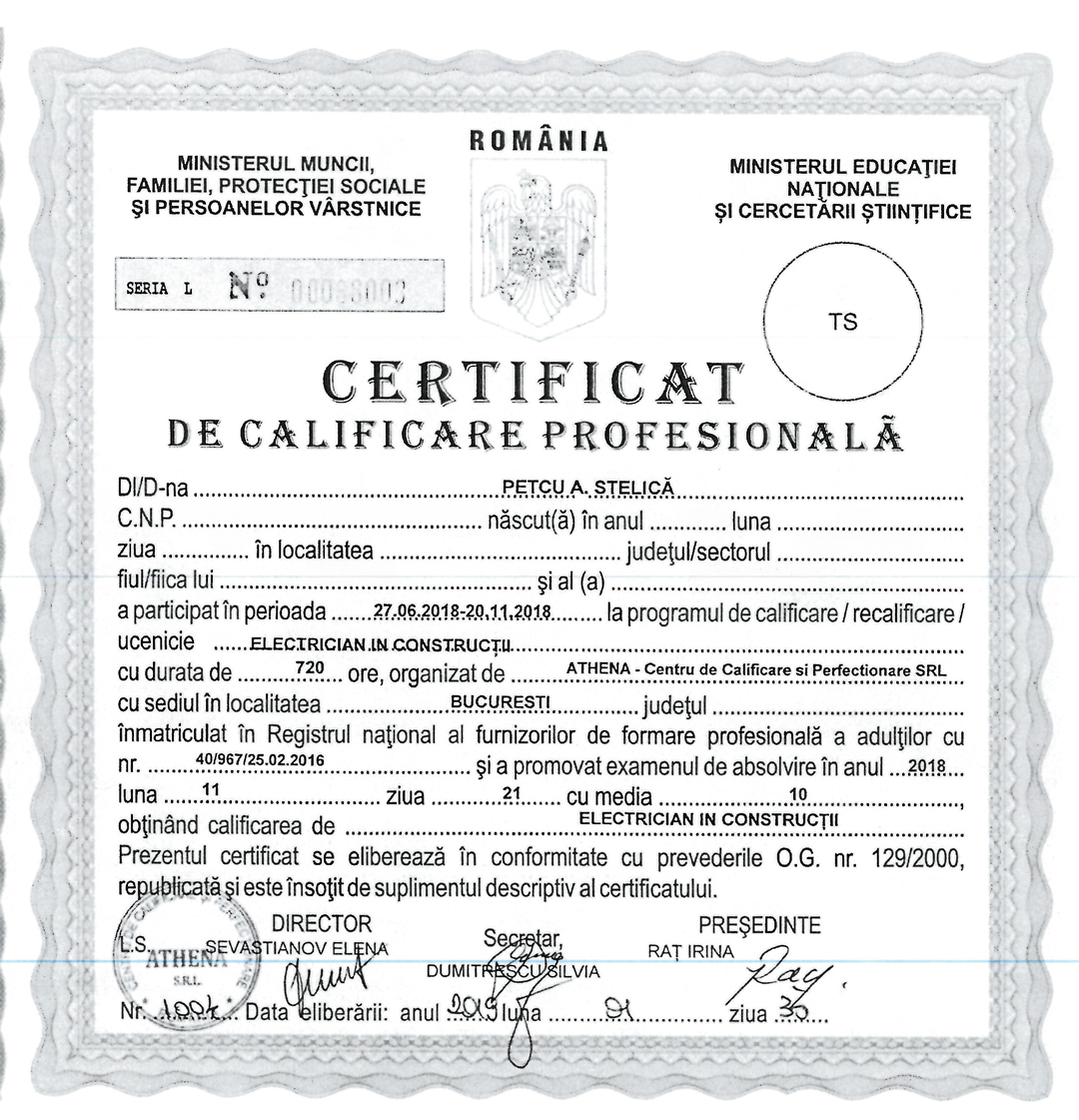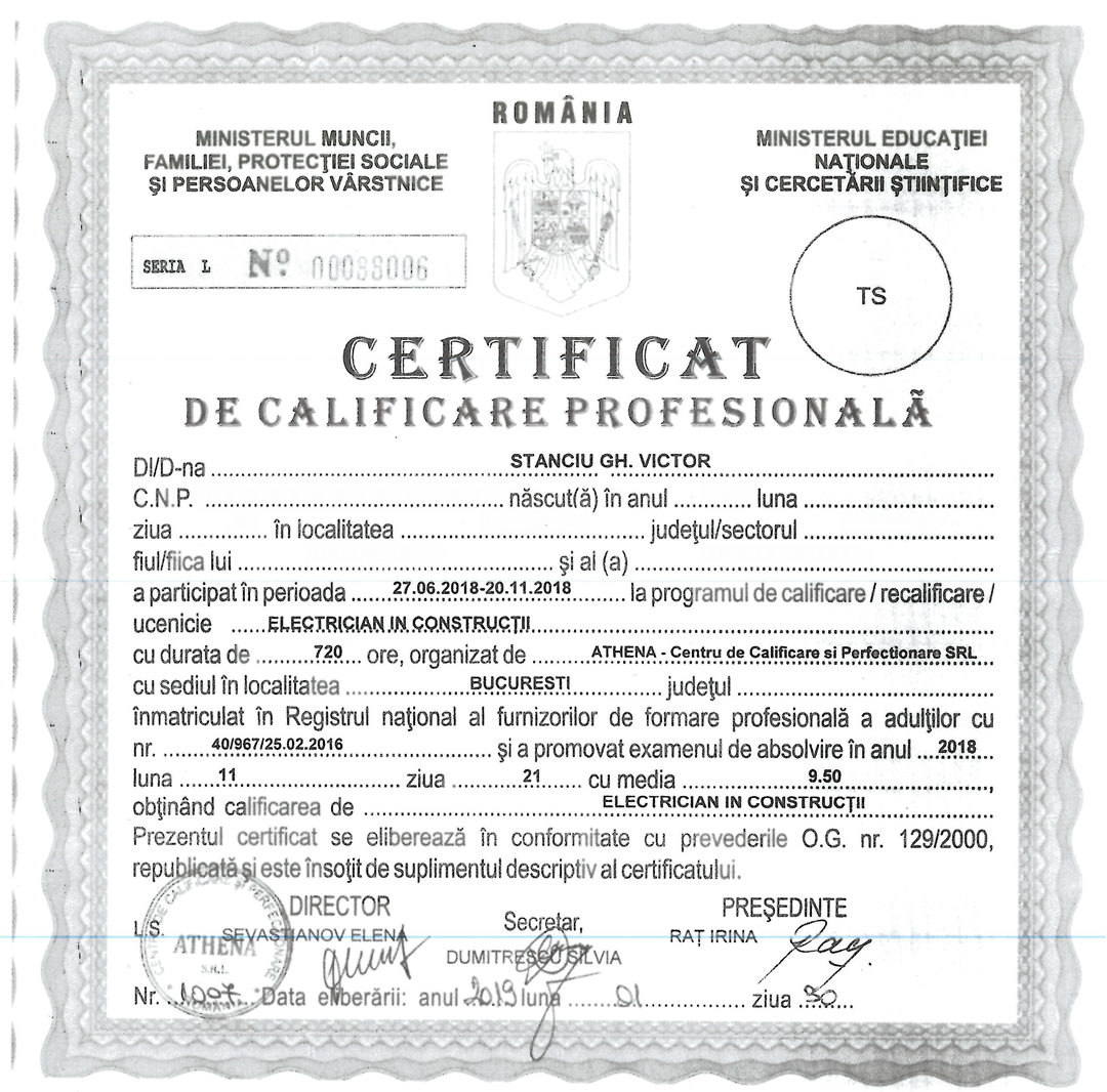 Colegii noștri din departamentul Mecano-Electric, Stelică Petcu și Victor Stanciu au obținut certificarea profesională de Electrician în construcții în urma unui program intensiv organizat de ATHENA – Centru de Calificare și Perfecționare. Certificatul de calificare este recunoscut în întreaga Uniune Europeană.