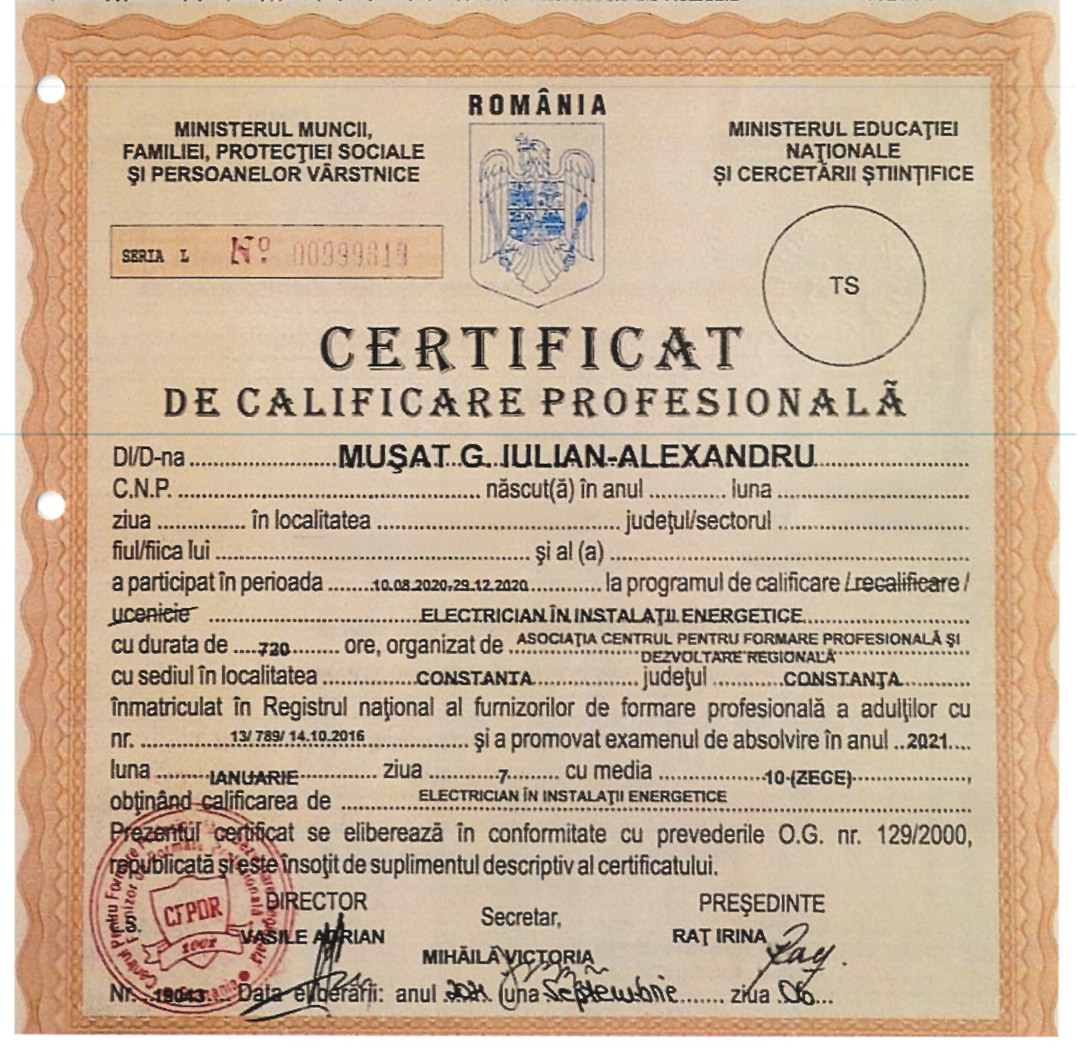 Colegii noștri din departamentul de Operațiuni, Alexandru Mușat și Alexandru Gurău, au obținut certificarea în meseria de Electrician în instalații energetice în urma absolvirii programului de formare profesională organizat de Asociația Centrul pentru Formare Profesională și Dezvoltare Regională. Certificatul este recunoscut atât la nivel național, cât și internațional, în conformitate cu O.G. 129/2000.