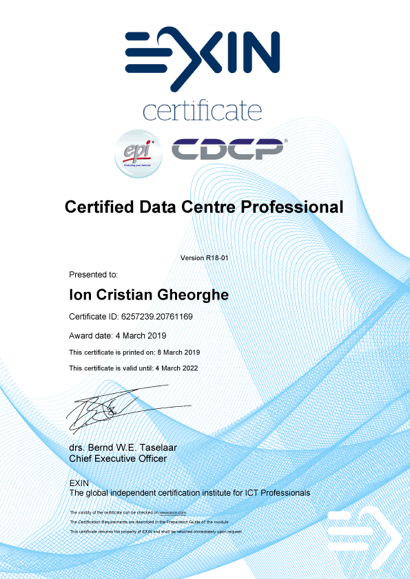 Alexandru Mușat și Ion Gheorghe, managerii de tură ai celor două centre, sunt certificați CDCP®. Prin această pregătire, ei au dobândit cunoștințe solide în proiectarea și operarea centrelor de date, în infrastructura fizică, energetică, de răcire, securitate și de cablare. CDCP® acoperă toate componentele critice care contribuie la disponibilitatea și performanța unui centru de date – de la electricitate, climatizare și protecție împotriva incendiilor, până la sisteme BMS, DCIM, și strategii legate de redundanță.