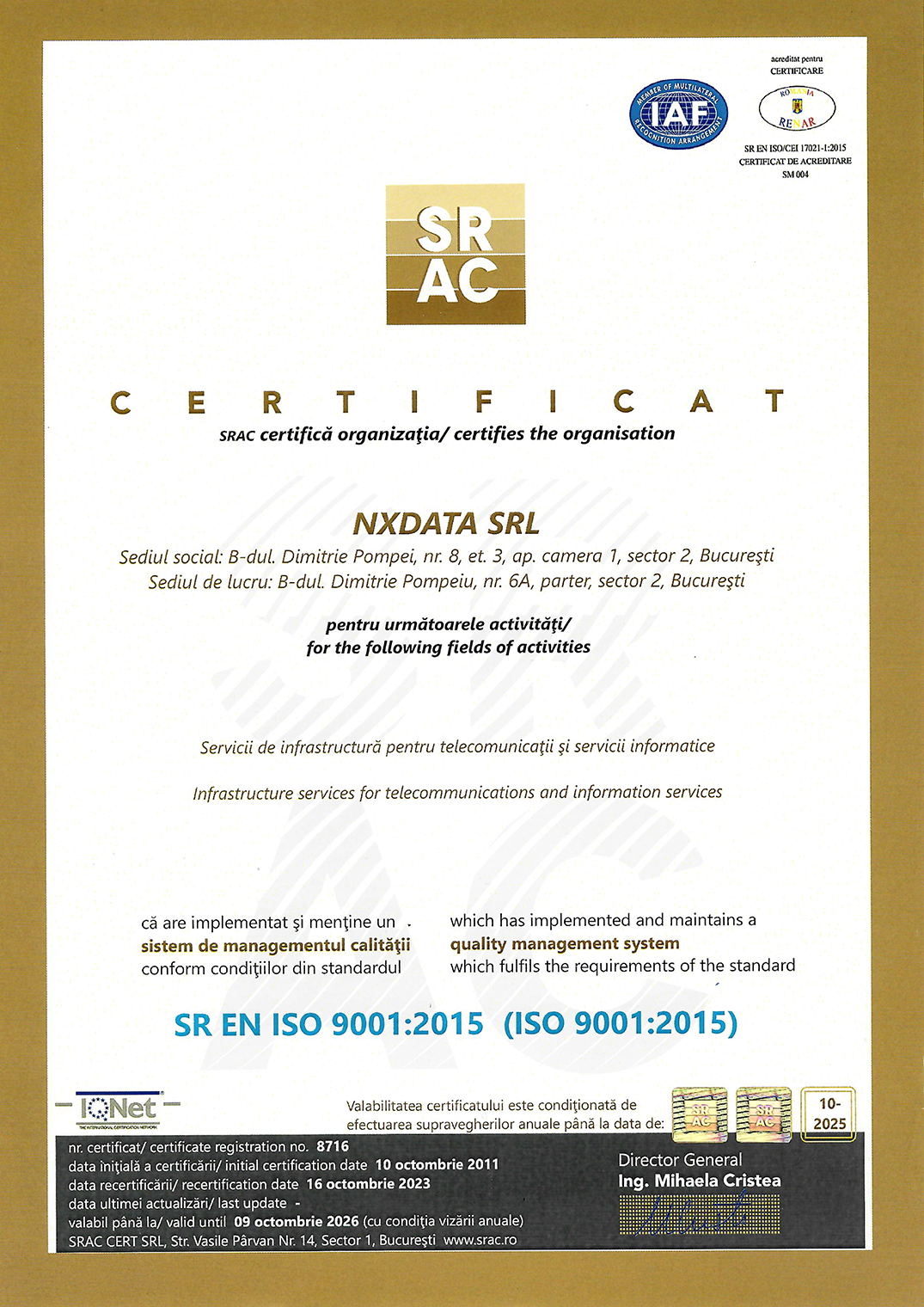 În cadrul NXDATA, ne concentrăm constant pe îmbunătățirea proceselor interne și pe livrarea unor servicii de calitate superioară. Obținerea certificării ISO 9001, un standard global pentru sistemele de management al calității (QMS), ne reconfirmă statutul de furnizor de încredere în domeniul colocării, capabil să răspundă cu eficiență și profesionalism cerințelor clienților și ale tuturor părților interesate. Prin implementarea celor șapte principii fundamentale ale managementului, printre care orientarea către client, implicarea personalului și îmbunătățirea continuă, ISO 9001 ne susține să dezvoltăm procese eficiente și să menținem un standard înalt de calitate. Aceste principii sunt esențiale în asigurarea unei performanțe operaționale optime, iar prin această certificare, ne consolidăm capacitatea de a răspunde nevoilor clienților noștri și de a menține relații solide cu partenerii, de a ne asigura continuitatea operațională și de a gestiona eficient riscurile, oferind în același timp garanția unei recunoașteri internaționale a calității serviciilor noastre.