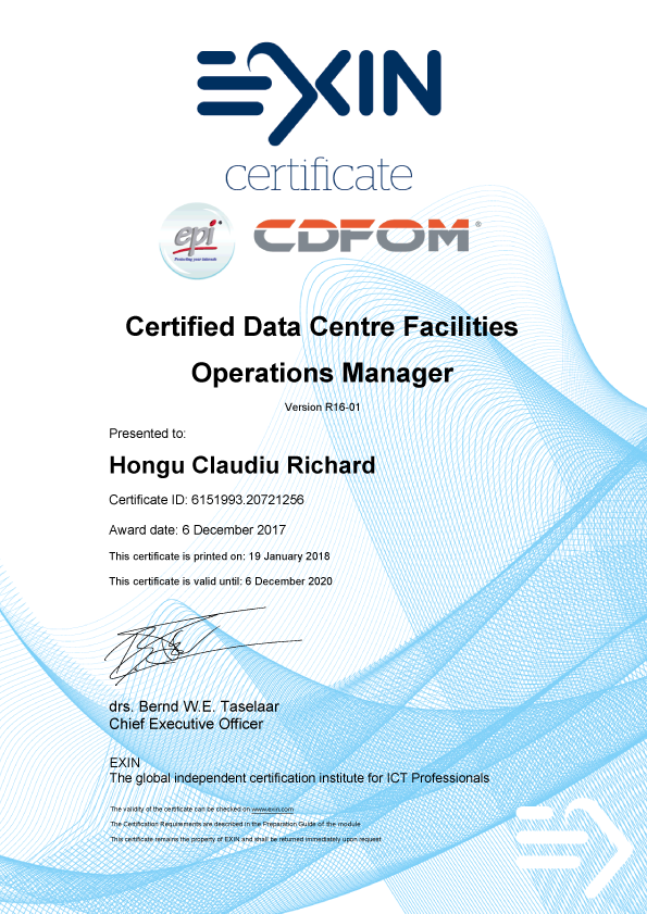 Managerii noștri de site și de tură dețin certificări recunoscute la nivel internațional emise de EPI, lider global în formarea profesională pentru industria centrelor de date.