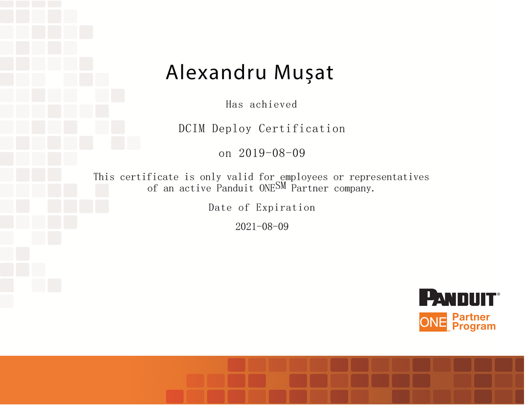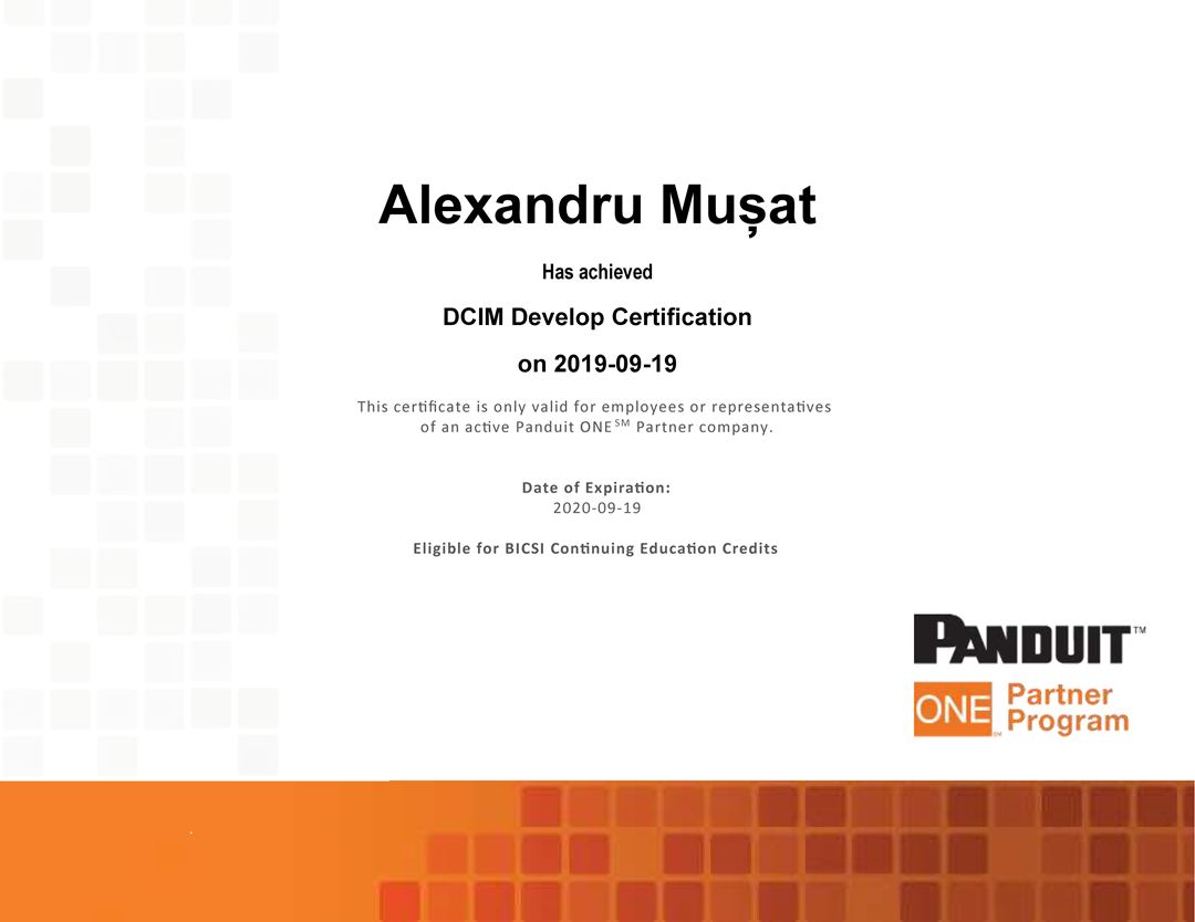 Alexandru Mușat (NXDATA-1 Shift Manager) a obținut certificarea din partea partenerului Panduit în domeniul Data Center Infrastructure Management (DCIM), demonstrând expertiză în configurarea, implementarea și utilizarea platformei DCIM, o soluție avansată de monitorizare și administrare a infrastructurii critice din centrele de date. Această platformă este o soluție integrată de DCIM (Data Center Infrastructure Management) care oferă organizațiilor control complet asupra energiei, climatizării, echipamentelor și activelor IT din infrastructura unui centrul de date. Platforma combină capabilități de analiză în timp real, automatizare și vizualizare, susținând performanța, eficiența și securitatea operațională.