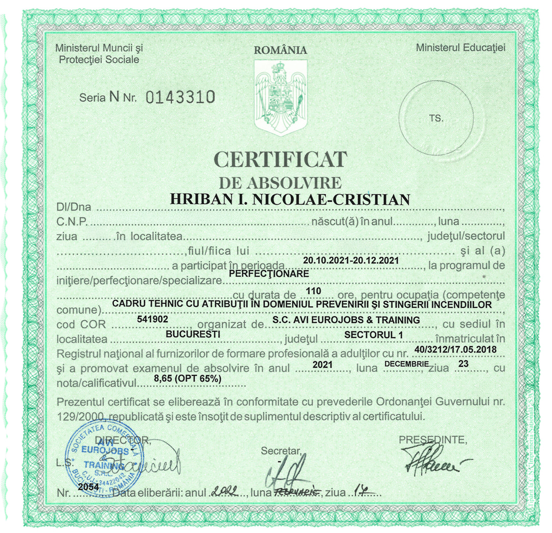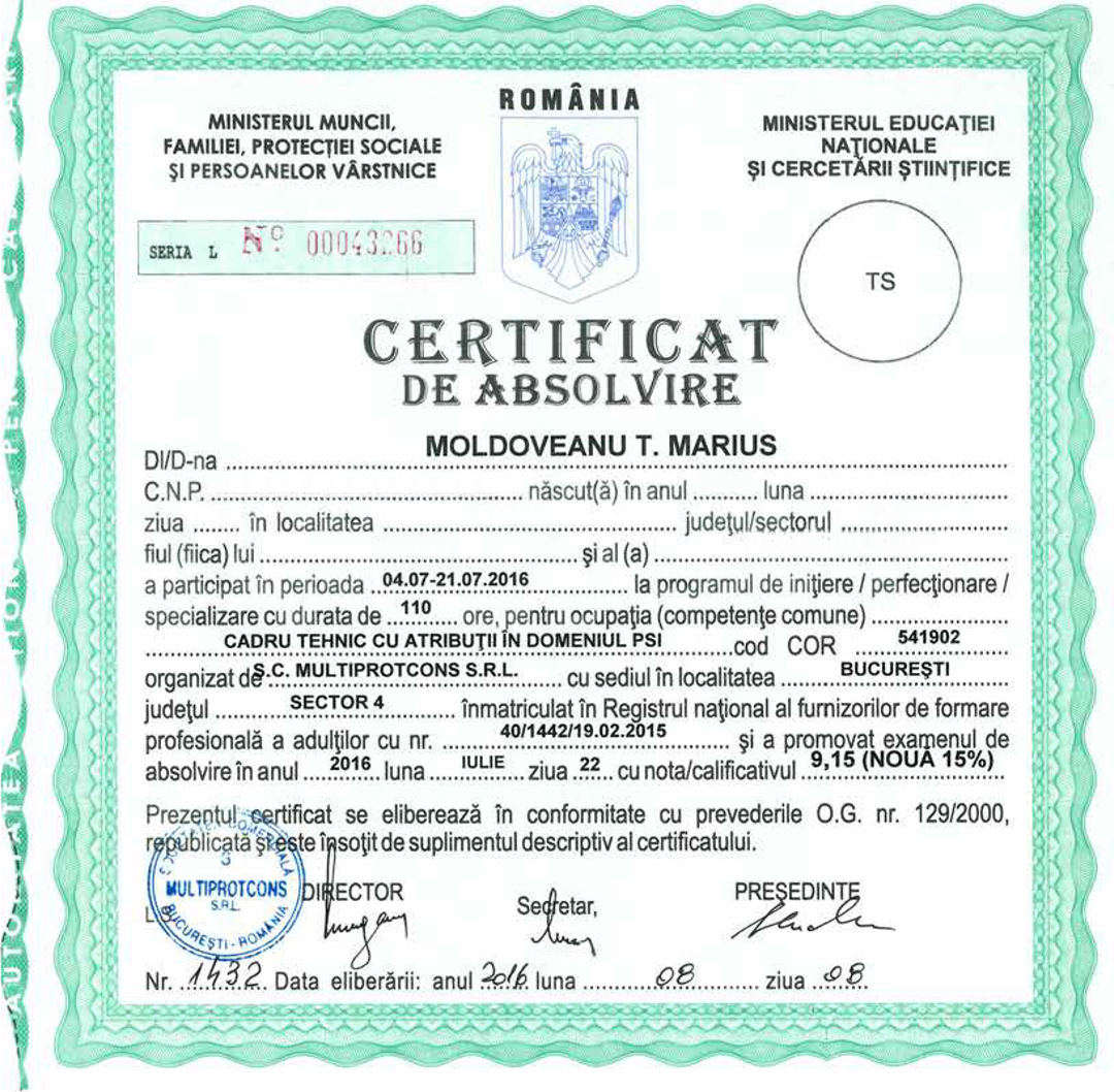 Această calificare atestă competențele noastre în planificarea, organizarea, monitorizarea și controlul activităților de prevenire și stingere a incendiilor, instruirea personalului și controlul respectării măsurilor PSI, acordarea de asistență tehnică de specialitate și elaborarea documentației specifice în conformitate cu Legea 307/2006 privind apărarea împotriva incendiilor și OMAI 163/2007 pentru aprobarea Normelor generale de apărare împotriva incendiilor.