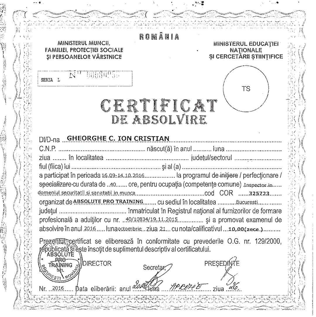 Colegii noștri din departamentul Operațiuni, Ion Gheorghe, Richard Hongu și Cristian Hriban dețin certificarea de specialiști în domeniul Securității și Sănătății în Muncă (SSM), obținută în urma absolvirii cursului organizat de Absolute Pro Training.