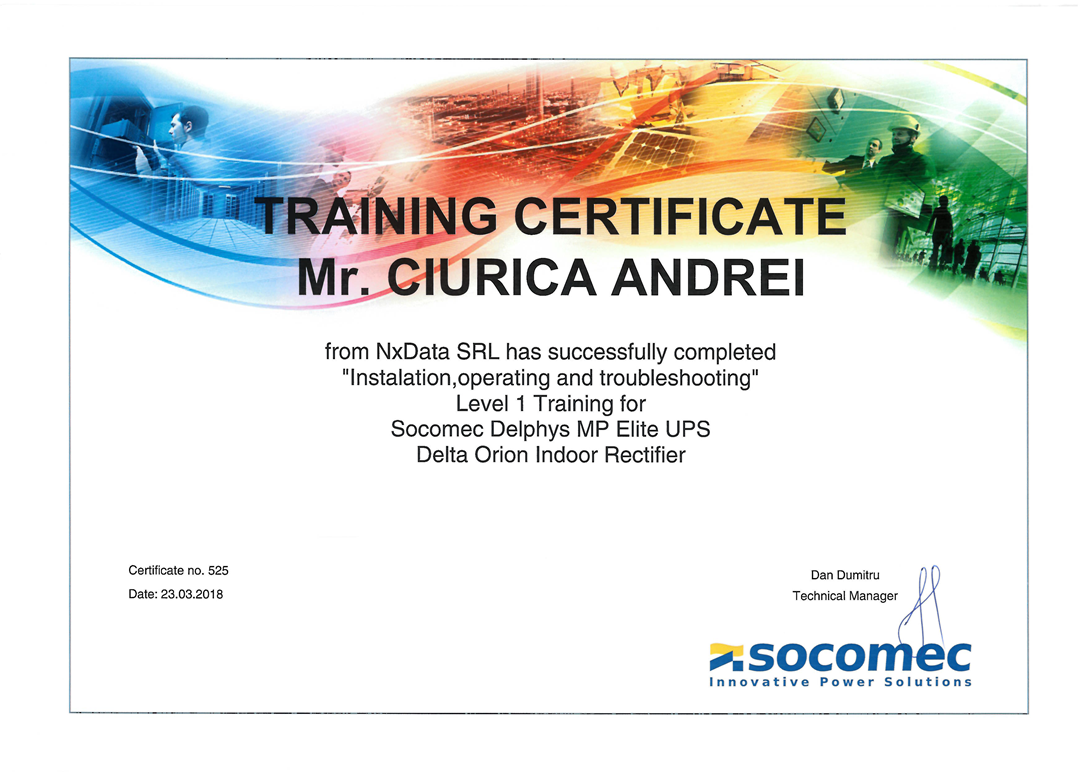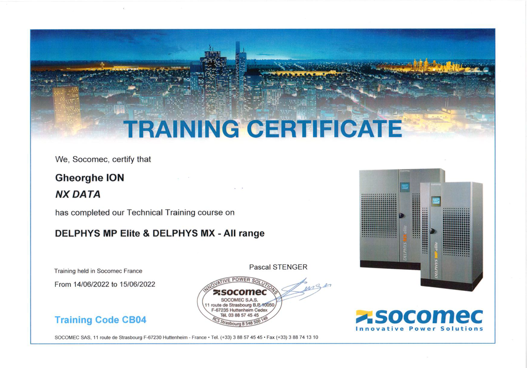 Colegii din echipa de Monitorizare NXDATA, Robert Drugă, Andrei Ciurică și Ion Gheorghe sunt instruiți și certificați de către partenerul SOCOMEC, lider internațional în soluții de alimentare neîntreruptibilă (UPS), garantând astfel expertiza noastră tehnică în operarea și mentenanța echipamentelor critice.